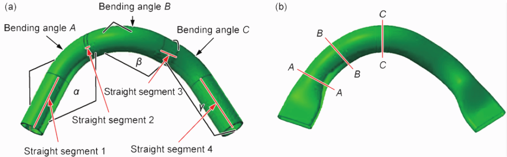 管材在CNC彎曲過程會(huì)產(chǎn)生回彈、截面畸變以及內(nèi)側(cè)受壓失穩(wěn)起皺、外側(cè)受拉開裂等缺陷,對(duì)于多道次大角度數(shù)控彎曲,回彈會(huì)嚴(yán)重影響管件的成形精度,在隨后的內(nèi)高壓成形過程中會(huì)產(chǎn)生咬邊缺陷,所以通常需要在CNC彎曲時(shí)進(jìn)行適當(dāng)角度的補(bǔ)償。