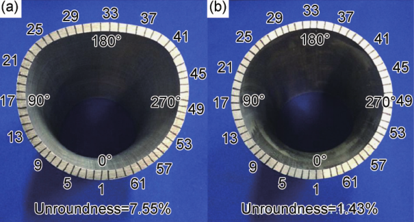 管材在彎曲時(shí),在彎矩的作用下,中性層外側(cè)受到拉應(yīng)力,內(nèi)側(cè)受到壓應(yīng)力,二者的合力使管件法向直徑減小,橫向直徑增大,管件截面由圓形變?yōu)榻茩E圓,即發(fā)生畸變。在管徑、彎曲半徑及潤滑條件不變的情況下,通過不帶芯頭的聚氨酯芯棒和帶有一個(gè)芯頭的剛性芯棒分別進(jìn)行CNC彎曲,得到了2種具有不同不圓度的截面,如圖C所示。其中聚氨酯芯棒的好處是可以使管件內(nèi)部避免劃痕,但得到的彎管截面不圓度較大;帶有一個(gè)芯頭的剛性芯棒的好處是得到的彎管截面不圓度較小,但與管件內(nèi)部發(fā)生硬接觸,容易在彎曲過程產(chǎn)生內(nèi)部劃痕。