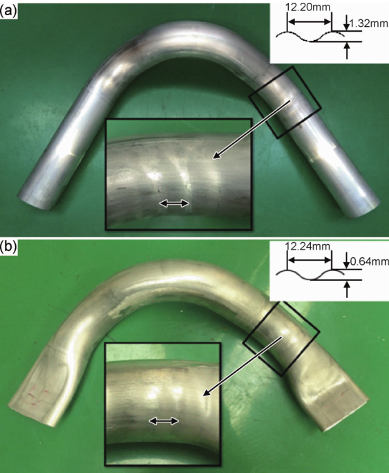 寇永樂等研究人員則針對(duì)CNC彎曲中截面畸變的影響因素進(jìn)行了研究,指出增加芯頭個(gè)數(shù)和芯棒伸出量、壓塊無潤滑有利于減小彎管的截面畸變。CNC彎曲中另一個(gè)典型的缺陷是起皺,不僅影響其成形性能,而且影響美觀,所以在CNC彎曲時(shí)要盡量避免。