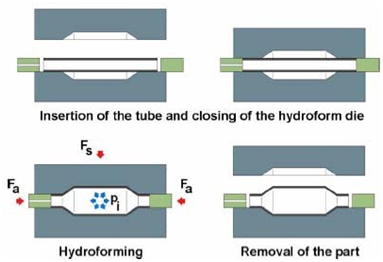 內高壓成形原理是通過內部加壓和軸向加力補料把管坯壓入到模具型腔使其成形,成形時內壓和軸向進給按事先給定的匹配關系,由計算機精確控制。