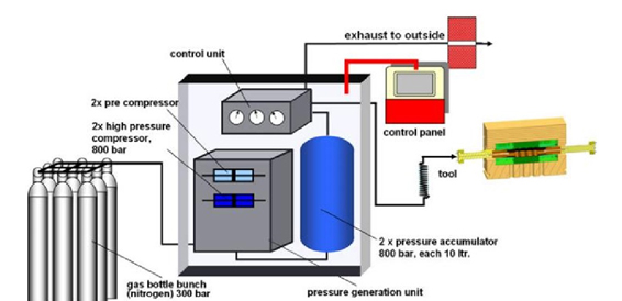 該成形技術早起主要集中在輕質難變形合金的成形過程中,近些年來隨著高強鋼在汽車上用量的不斷增加,熱氣脹成形裝備不斷發展進步,國外相關研究人員簡歷的高壓氣脹成形設備如圖33所示。