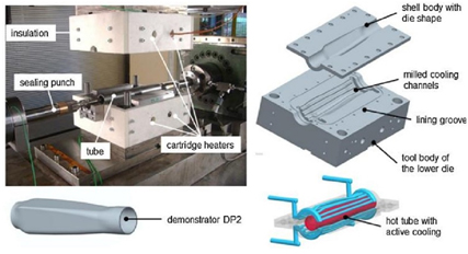通過高壓氣體增壓器該設備最高可以獲得理論80MPa氣體壓力,最高成形溫度達1000℃,而且該裝置可以實現對高強鋼管材的快熟加熱、快速成形及淬火處理。先用感應線圈將管材迅速加熱到奧氏體化溫度,保溫一段時間之后,迅速轉移到模具中,快速合模、密封、加壓脹形、淬火、脫模冷卻,脹形強化后掛彩局部強度可達1400~1600MPa。