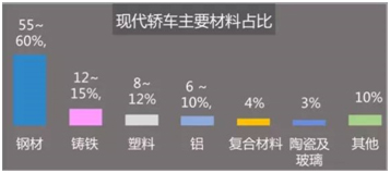 據統計,如圖8所示,現代轎車中占自重90%的六類材料分別是鋼材(55~60%)、鑄鐵(12~15%)、塑料(8~12%)、鋁(6~10%)、復合材料(4%)、陶瓷及玻璃(3%)、其他(10%)。