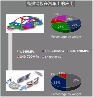 理論上,相對于傳統340MPa的材料,600MPa級鋼材的減重潛能約為20%,800MPa級鋼種的減重潛能可達30%以上,強度級別在1000MPa以上的鋼材在汽車上的比重已經達到16%。