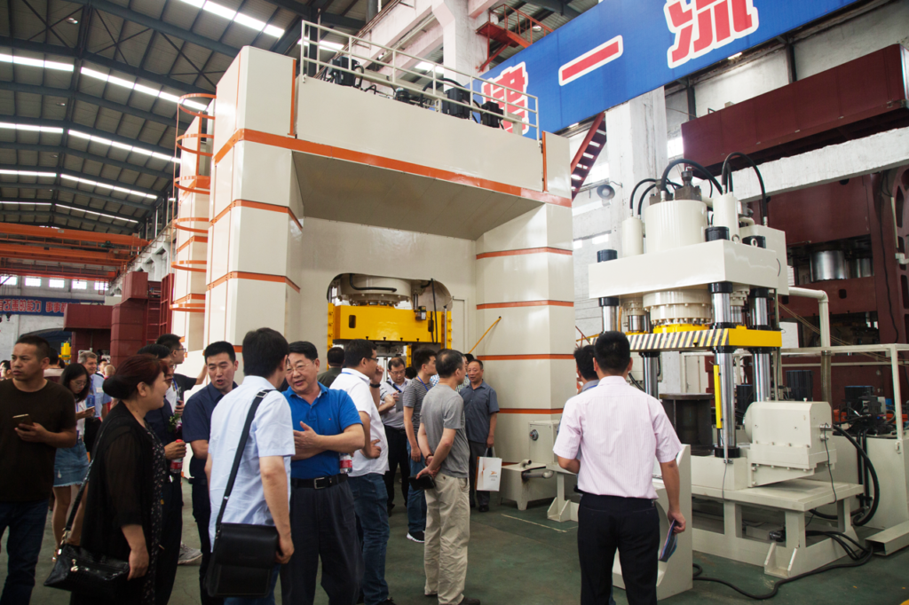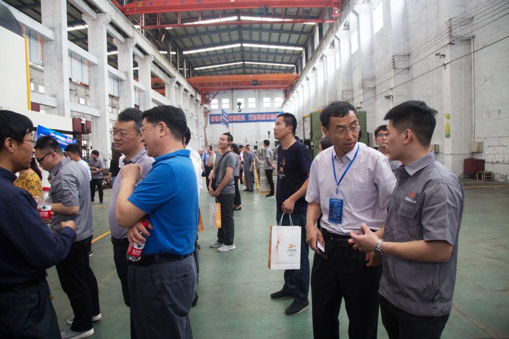 企業參觀交流接近尾聲,與會專家們駐足于我司自主研發專利的國內(國際)首臺套“榫卯結構4000T內高壓成形設備”前并對其仔細觀賞。據悉此設備具有高精度、高效率、高自動化生產能力、低能耗等特點,并可實現汽車管件等大型構件的一體成形,主要應用于大型航空航天飛行器管件、汽車管件和石油輸送系統管道等零件的一體液壓成形。專業技術人員解說完畢,專家代表們紛紛深表贊嘆,同時還與我司專業技術人員互相提問交流,場面可謂熱火朝天。