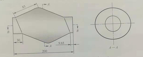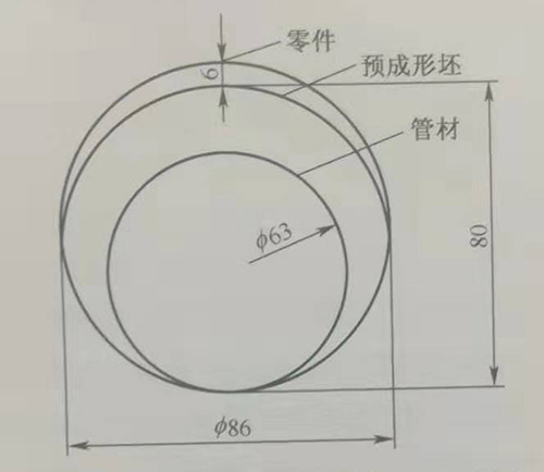 異形雙錐形管件的材料為1Cr18Ni9Ti,均勻延伸率45%,幾何形狀如圖2—41所示。管材直徑為56mm,壁厚為2.5mm。該件內(nèi)高壓成形有兩個難點: