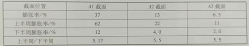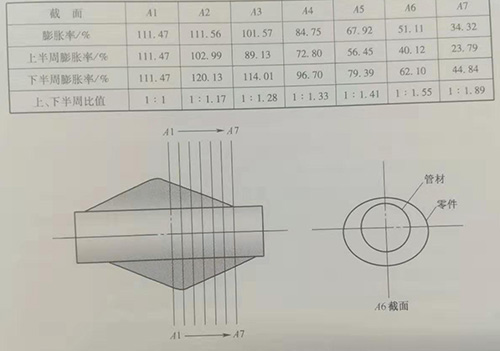 表2-7是三個截面膨脹率的計算結(jié)果。A1、A2、A3的膨脹率分別是37%、13%和6.5%,而上半周膨脹率分別是62%、22%和11下半周膨脹率分別是12%,4%和2%,三個截面的上半周膨脹率和下半周膨脹率之比分別為5.17、5.5和5.5。可見由管材到零件的成形過程中上、下半周的膨脹率相差很大,變形過程是非對稱的,其中最大變形截面A1截面的上、下半周的膨脹率相差5倍以上,尤其是上半周的膨脹率達(dá)到了62%,成形難度很大。