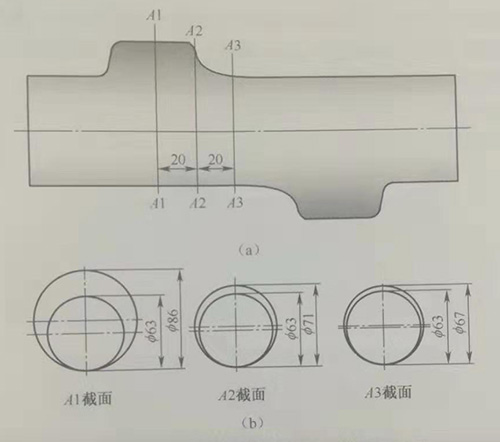 為了分析空心曲軸內(nèi)高壓成形的變形特點,在曲軸上選取了A1、A2和A3個典型截面,每個截面相隔20mm,如圖2-45(a)所示。A1截面位于曲拐中間,A2截面位于曲拐與中間過渡段之間,A3截面位于兩個曲拐中間,三個截面的形狀如圖2-45(b)所示。
