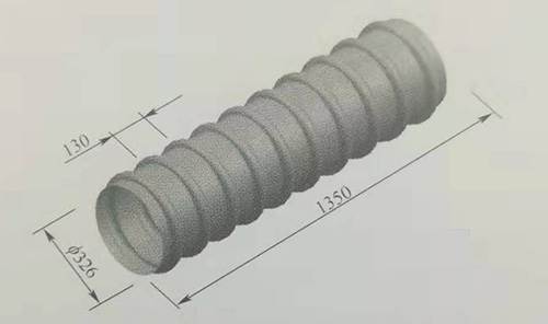 長距波紋管是一種典型的大尺寸變徑管件,其直徑范圍從240mm至500mm,材料為5A03鋁合金,如圖2-48所示。由于波紋之間的距離較長,一般大于100mm,現(xiàn)有制造波紋管的技術(shù)無法制造這種長距波紋管。目前的制造工藝是采用“滾筒一焊接”的技術(shù)路線制造,合格率低、焊縫可靠性差。本文興迪源機械帶來長距波紋管的內(nèi)高壓成形詳解。