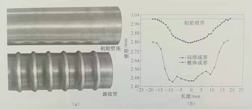 圖2-50長距波紋管及波紋區(qū)壁厚變化 (a)長距波紋管;(b)波紋區(qū)壁厚分布。