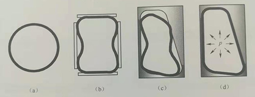 (a)管材;(b)預成形;(c)合模;(d)內高壓成形。