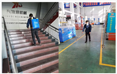 我司堅持每天對辦公區,生產車間,生活區等區域全方位無死角消毒。(圖為付波,范傳彩)