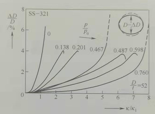 圖3-9~圖3-11所示為德國斯圖加特大學(xué)研究結(jié)果。其中:△D為截面直徑變化量,△D/D為管材截面直徑變化率;k為彎管的曲率,k/k1為歸一化的曲率,k1=t/d2;P為管材內(nèi)壓,Po/P為歸一化的內(nèi)壓,Po/P=2σot/Do。