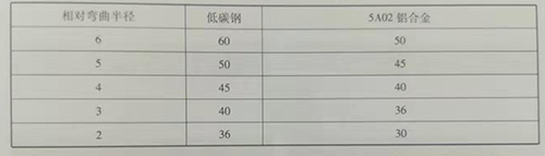管材充液壓彎的極限徑厚比除了與材料有關(guān)外,還與彎曲半徑有關(guān)。不同彎曲半徑下,低碳鋼和鋁合金管材充液壓彎可達到的極限徑厚比如表3-4所示,極限徑厚比隨彎曲半徑減小面逐漸減小,當(dāng)相對彎曲半徑為2-3時,低碳鋼和鋁合金管件的極限徑厚比不超過40。