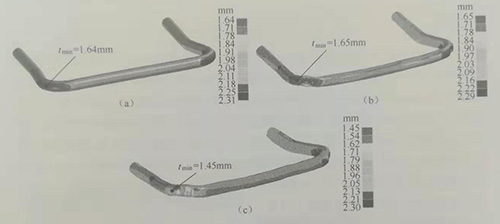 彎曲后外側最小壁厚為1.64mm,減薄率為18%;內側增厚,最大壁厚為2.31mm,增厚15.5%。預成形后最小壁厚基本不變。
