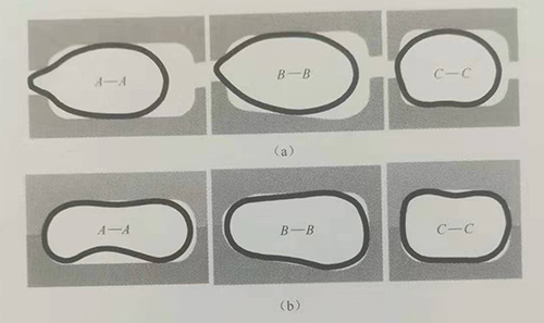 圖3-61合模過程(a)彎曲管直接合模;(b)預(yù)制坯合模。