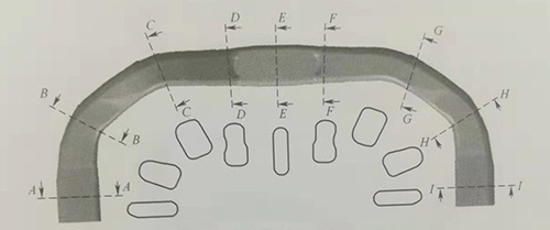 本文興迪源機(jī)械帶來MPV轎車副車架內(nèi)高壓成形詳解,MPV轎車副車架主管是一個(gè)典型的軸線為三維空間曲線的空心變截面結(jié)構(gòu)件,如圖3-60所示。截面周長(zhǎng)沿軸線發(fā)生變化,最大截面周長(zhǎng)245.4mm(D一D截面),最小截面周長(zhǎng)234.2mm(C-C截面),零件上有10個(gè)直徑?10mm的孔。