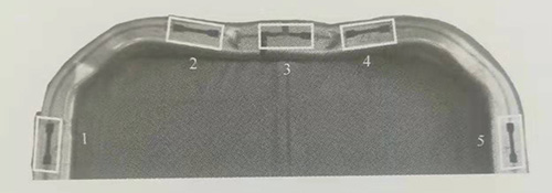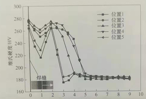 分別于內(nèi)高壓成形件所標(biāo)注的1-5位置處測(cè)量硬度,硬度測(cè)量結(jié)果如圖3-65所示,在焊縫中心位置,硬度最大,在焊縫熱影響區(qū),硬度有所降低,在遠(yuǎn)離焊縫的母材區(qū)域,硬度基本保持不變。