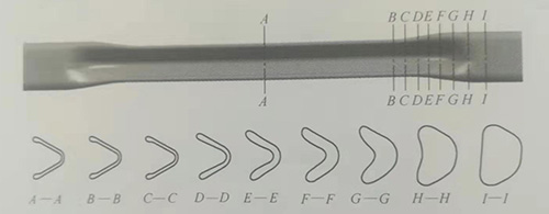 本文興迪源機(jī)械帶來超高強(qiáng)鋼(780MPa)扭力梁內(nèi)高壓成型,管件為V形截面結(jié)構(gòu),沿軸線方向截面變化復(fù)雜,截面周長變化大。