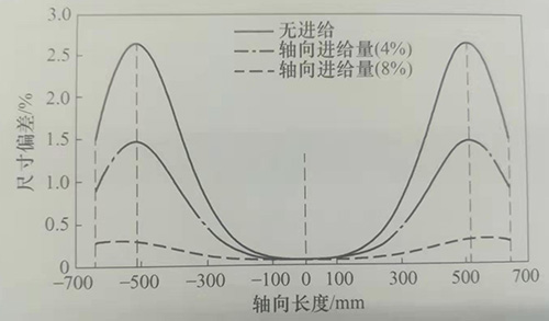 軸向進(jìn)給可以顯著改善零件的尺寸精度,圖3-75給出了扭力梁內(nèi)高壓成形件尺寸精度測量結(jié)果。當(dāng)沒有軸向進(jìn)給時(shí),最大尺寸偏差為2.7%,位于端部位置;當(dāng)軸向補(bǔ)料量為4%時(shí),最大尺寸偏差降低到1.5%;而當(dāng)軸向進(jìn)給增加到8%時(shí),整個扭力梁的尺寸偏差在0.5%以內(nèi),滿足設(shè)計(jì)要求。