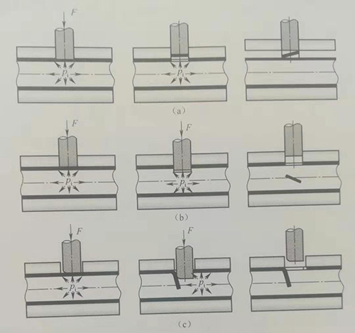 (a)由內向外沖孔;(b)由外向內沖孔;(c)沖孔彎曲。