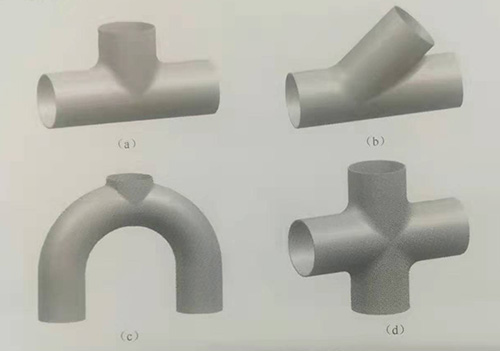 多通管件的種類較多,按照多通數量分為直三通管(T形管)、斜三通管(Y形管)、U形三通管、X形四通管和五通以上的多通管,如圖4-1所示。按主管、支管直徑大小分為等徑和異徑多通管;按軸線形狀,分為直線和曲線多通管;按對稱性,分為對稱和非對稱多通管。