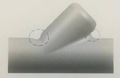 多通管內(nèi)高壓成形過程中,由于內(nèi)壓、左右兩端軸向進(jìn)給量及中間沖頭后退量匹配的不合理,會(huì)出現(xiàn)不同的缺陷形式。T形三通管內(nèi)高壓成形的主要缺陷形式有支管頂部破裂、主管起皺,如圖4-5所示;而Y形三通管由于結(jié)構(gòu)的不對稱性還會(huì)出現(xiàn)支管過渡區(qū)內(nèi)凹的缺陷,如圖4-6所示。