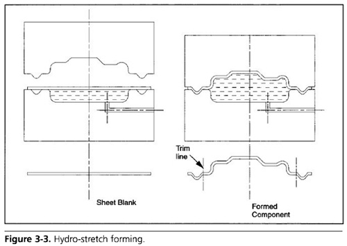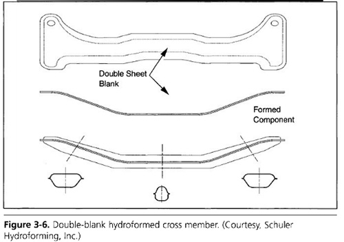 然后將流體壓力引入坯料中間,將材料拉伸成形到模具型面。該方法可用于生產不同長度線的組裝和全封閉截面,如圖3-6所示,每個毛坯的厚度可以不同,以滿足質量和結構性能要求。
