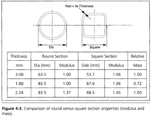圖4-3中的表格顯示了基于2.5英寸(64 mm)的方形截面,直徑圓形截面對于相同質量具有6%的較高強度。