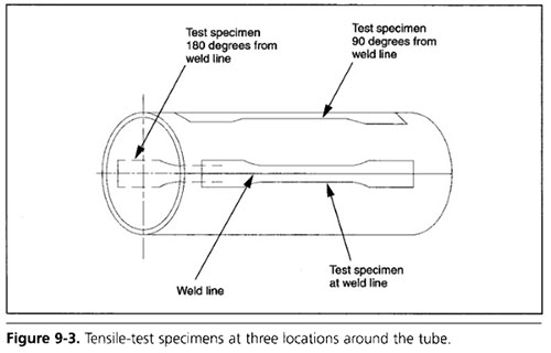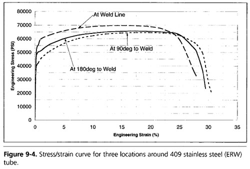 從管子縱向和周圍不同位置切下的試樣的拉伸試驗通常顯示出不同程度的應變硬化,圖9-4顯示了圖9-3中所述三個位置(焊接位置,與焊縫成90度,與焊縫成180度)的拉伸試驗結果。