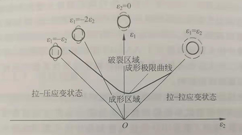 同時,縱坐標將成形極限圖分為左側部分(拉-壓應變狀態)和右側部分(拉-拉應變狀態),圖中還列舉了四種比較特殊的應變路徑ε1=ε2,ε2=0,ε1=-2ε2,ε1=-ε2,各種極限應變狀態點均隨應變路徑的改變而改變。目前,獲取管材成形極限圖的方法主要有理論解析法、試驗法和數值仿真法三種。