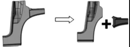 (3) 一些形狀極不規則的件也盡量考慮拆分成較規則件后再 焊接的方式生產,如圖 2 側圍 A 柱內板拆分前材料利用率只有 30% ,拆分成兩個制件后整體材料利用率可以達到 58% 。反之, 有時也可以把不規則的相連接件合并成一個較規則的件生產。