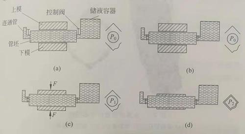 (a)注入液體;(b)密封管件;(c)閉合模具;(d)沖壓成形
