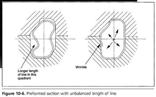 較深的皺紋也有可能將材料聚集到局部區域,產生不平衡的線長狀況。在圖10-6所示的預成形部分中,有褶皺的象限具有較長的線長度。