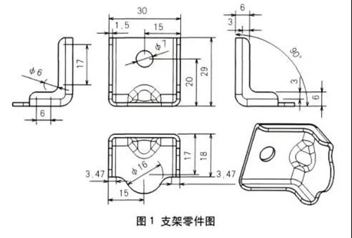 圖 1 為支架零件圖 。單車型多處使用且 多車型共用 ,現有沖壓壓件模具使用年限較長無法繼續滿足新老車型的大量使用 ,故在新車型開發階段考慮能夠滿足大批量生 產的級進模設計 。該零件比較簡單 , 僅有一處沖孔和一處彎曲 ,但零件彎曲為 90 度,對沖孔位置精度要求較高 。