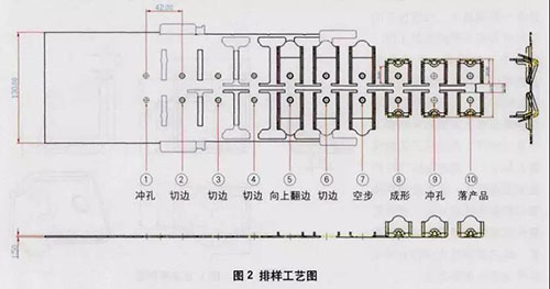 根據該支架零件的外形特點 ,單件為不 對稱彎曲 ,成形時工件易渭動質量無法保證 , 又因該零件較小 , 考慮采用對排保證 零件及 料帶的穩定 。由于該零件料厚 為 1 5mr啊 , 對排后中間連料方案料帶的剛性可以滿足送 料要求 。綜上考慮 ,選定的排樣方案 為 10 個工位 ( 圖2 ) ,各工位依次為;中導正銷孔、 切邊 、 切邊 、 切邊 、 翻邊 、 切邊 、 空位、 成 開豆 、 精 中孔、 切斷。