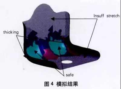模擬結果如圖 4 所示 ,零件 R 角中間位 置存在凹凸造型 , 變形充分 , 未出現工藝缺 陷, 圖中 safe 所在位置 , 零件兩側中間位 置型面整個過程保持平整 ,未產生變形 , 圖 中 lnsuff stretch 所在位置 ,但零件 R 角處兩 側位置在第二序成形過程中 ,存在多料問題 , 成形后產生起皺缺陷 , 圖中 thick ing 所在位 置 。因此在該位置前序落料時增加工藝缺口 ,圖 4 模擬結果 使該處成形得到改善 ,起皺缺陷消除 。