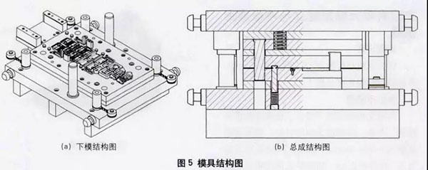 各沖裁、 成形凸模均以過盈配合加底部凸肩方式固定于上模 , 模真加工簡單 、裝配方便 ,且便于調整和修配 。凹模均采用鑲塊結構 ,將易磨損或難以加工部分以鑲件形式嵌入,降低加工難度 ,便于刃磨和維修 , 節省生產成本 。