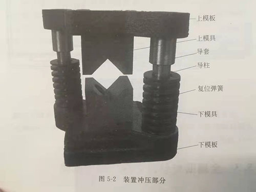 為了借助壓力機壓頭的上下運動實現對金屬薄壁管的沖壓,設計了一套沖壓裝置如圖5-2所示。它主要由上下模板、上下模具、導套、導柱和復位彈簧共七部分組成。上下模板主要用于安裝定位模具,將其放置于壓力機工作臺上,壓力機壓頭的上下運動即可讓上下模板帶動模具實現合模運動。