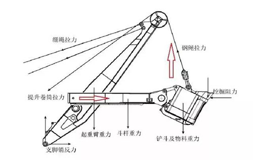 從圖中可以看出,當WK-75處于工作狀態,齒輪-齒條所產生的作用力以及鋼絲繩的拉力共同作用,使得鏟斗舉起。它所采用的齒輪-齒條傳動方式剛性強,針對露天礦中針對鏟裝松散度差、塊狀多、爆破差且有根底的物料產裝效率高。