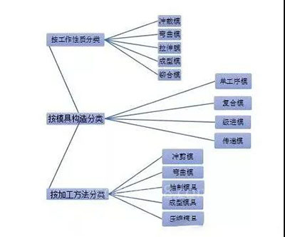 用通俗的話來講沖壓模具就是沖壓時使用的“模板”,一個模板只能沖壓出一種沖壓件,根據(jù)所要的沖壓件的不同尺寸、材料、形狀,需要選擇不同類型的沖壓模具,常見的沖壓模具分類如下: