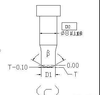 沙拉孔選擇:只要看到產品中有沙拉孔特征都需要先詢問客戶該孔的作用。再根據客戶提供的產品圖詳細的尺寸,設計人員必須以尺寸A與角度β為準,還需要滿足尺寸h1≥0.2mm來進行模具設計。