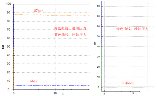 怠速工況為發動機在710rpm情況下,馬達進油口壓力:87bar,出油口壓力:5bar,殼體泄油壓力:0.45bar。