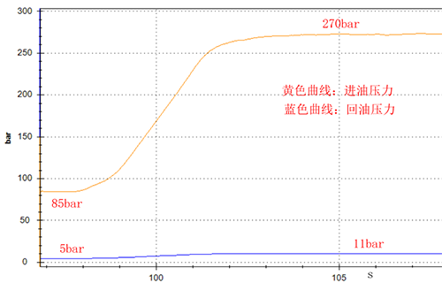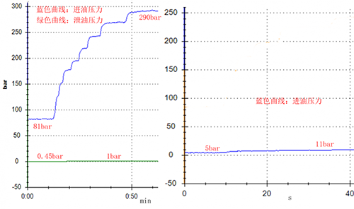 怠速工況到全速工況(710rpm升至1400rpm),馬達進油口壓力:81bar逐步升至290bar,出油口壓力:5bar逐步升至11bar,殼體泄油壓力:0.45bar逐步升至1bar。