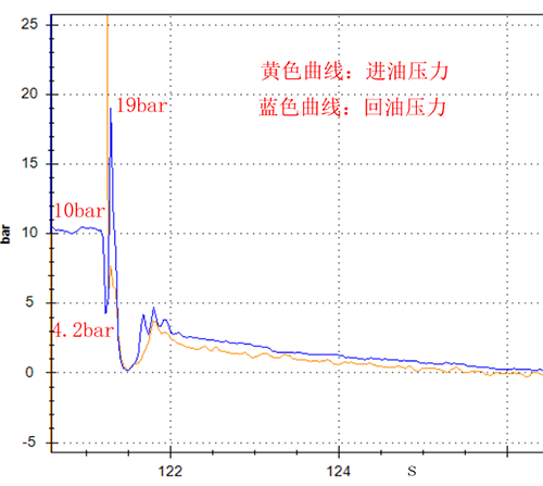 急停工況是按下面板上的急停按鈕,發動機瞬間熄火,測出的馬達進口壓力和出口壓力。