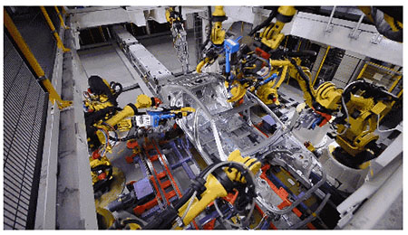 凱迪拉克機器人工廠的核心部分在車身車間,他是國內首個具備全鋁車身制造能力的車身車間,全部386臺機器人中將近一半在這里上班,車身車間面積4.5萬平方米,相當于6.3個足球場。