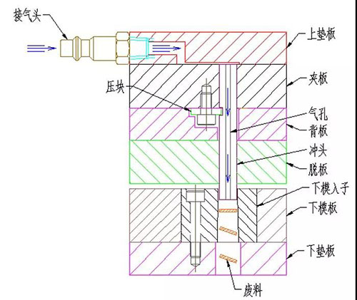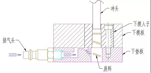 下墊板做氣管,工作時使刀口內形面真空,使廢料在空氣的流動中被帶出而達到防止廢跳料的目的。