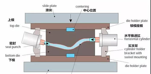 內高壓成形的?原理是利用帕斯卡定律通過內部加壓和?軸向加力補料把管坯壓入到模具型腔使其成形為所需要的?工件。對于軸線為曲線的零件,需要把管坯預彎成接近零件?形狀,然后加壓成形。