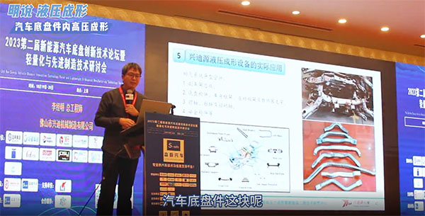 在此次會議上,我受主辦方邀請,在現場做了《流體壓力成形模具、工藝及使用案例》主題報告,分享了自己及團隊多年來在汽車底盤件及汽車其他零部件的輕量化生產工藝上的研究成果和技術經驗,引起了與會的很多同行,專家的巨大興趣。